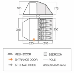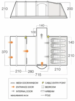 Vango have made a big improvement to their Sentinel fabric for the new season. This latest material has been dyed in a different method which not only increases the colour retention of the fabric but also the process uses 60% less water making it more eco-friendly. With a waterproof rating of 3,000mm HH, it is armoured with more than enough to cope with the typical British weather. The tent has key features such as dark âNightfall bedroomsâ which enable you to have a longer and better night’s sleep as you wonât be waking up when the sun does. Inside the bedroom there are also storage pockets to give you an easily accessible point for storing items like phones or torches so you can find them in the middle of the night. Other important features include cable entry points, privacy curtains, mesh windows internally and low-level panels externally; one of our favourite features is the drop-down doors. Unlike previous years Vango have added extra toggle points to the lip to decrease the chance of the wind from coming in.