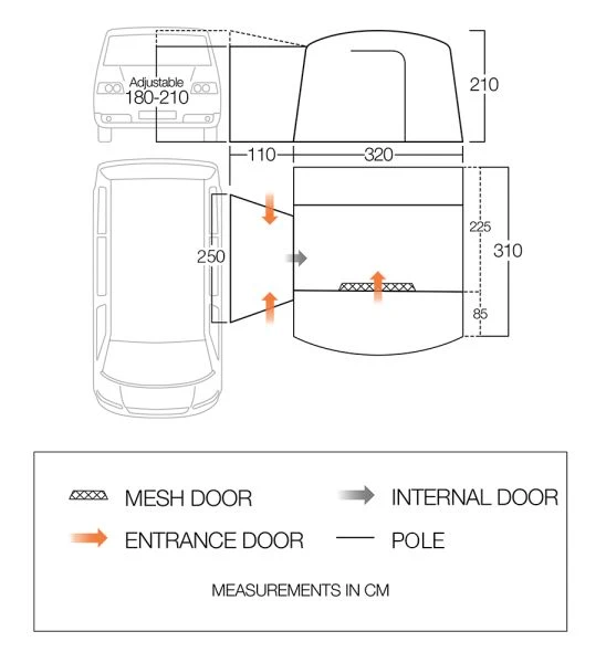 - Two Doors in Tunnel Attachment to Vehicle – For convenient access to the front or back of your vehicle
