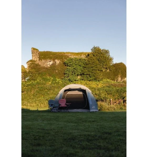 The Cragmor has Vango’s Nightfall Bedrooms which are queen sized to offer plenty of space and create a nice dark sleeping environment. Bedroom pockets can also be found in the inner to help declutter the area and give a perfect storage spot for keys, phones, and torches alike. The front door of the Vango Cragmor can be made into a canopy by purchasing some extra king poles. This allows you to increase your space away from the rain and protects the inside from getting wet. Small PVC window panels allow visibility out onto the campsite and curtains can be toggled into position to give privacy as and when needed. A hanging point for a lantern is at the centre of the tent along with mesh vents to increase airflow and reduce condensation. A linked in groundsheet comes supplied with the tent and can be easily rolled back to expose the grass beneath. High visibility guylines give stability to the tent while also being easy to see in the hope people don’t trip over them.