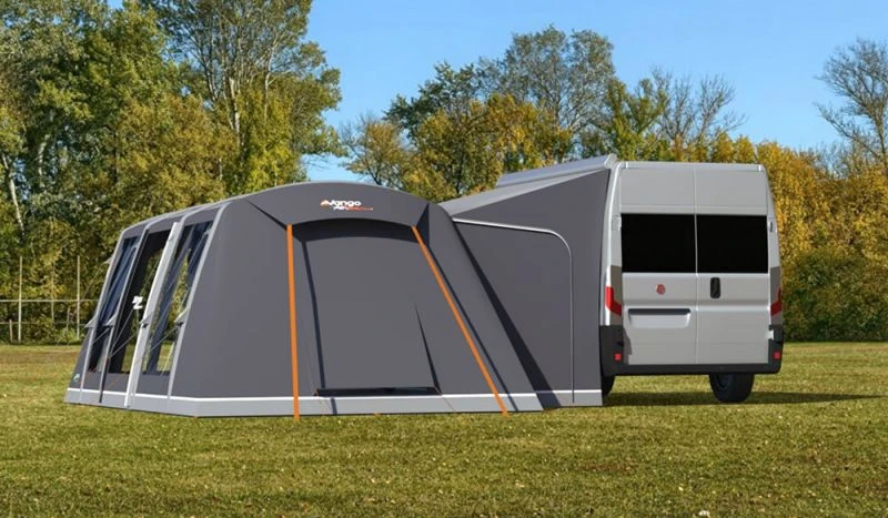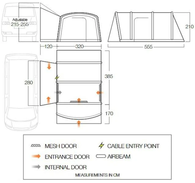 Throughout the awning there are ventilation points low and high. All of the doors that lead into the main body of the awning feature a mesh door. The two side doors also have a drop-down lip to allow you to bring wheel chairs and push chairs in. There are 4 different attachment methods that can be used to connect the awning to your vehicle, whether itās via a Kador Beading, Throw Over Straps, Velcro tabs for a roof rack or a Sleeve so that a pole can be threaded through and clamped into a gutter. Two tunnel doors allow the use to enter their vehicle without having to go through the awning and other key features included zip up curtains, oversized Airbeams, a sewn-in groundsheet and Vangoās SkyTrack System.