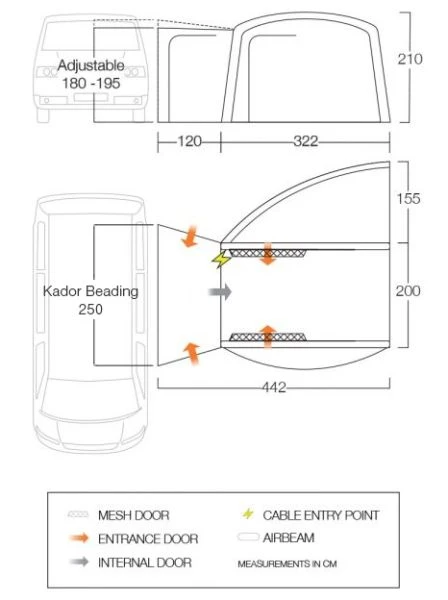A small pack size helps to combat the limited storage space usually found in campervans and the strong lightweight material means the awning is durable but easily transportable. Two full mesh doors opposite to one another give you the flexibility to change the direction you are facing depending on what the weather is doing, as well as allowing circulation of air into the awning without having insects coming in. Both doors also have drop-down entrances to allow a lip-free walkway into the main body of the awning, removing the usual trip hazard!